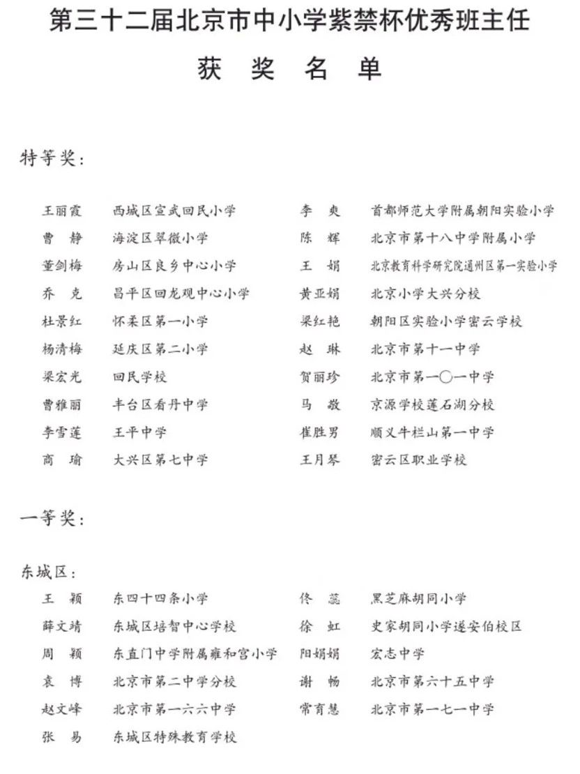 北京市中小学“紫禁杯”优秀班主任评选表彰活动是一项由政府部门主导、社会单位支持的奖励机制,每年奖励400名优秀班主任,从1988年至今已评选表彰优秀班主任12800人次,是全国持续时间最长、影响力最大的专门针对中小学班主任的制度性表彰活动。