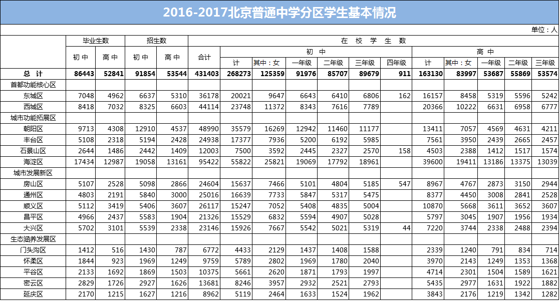 2016-2017年北京各区普通中学学生基本情况已公布,涉及的区有:东城、西城、海淀、朝阳、丰台、石景山、昌平区、通州区等,供2018北京小升初家长参考!