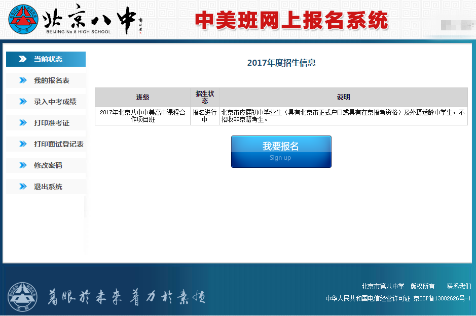 北京八中2017年中美班网上报名已经开始,面向北京应届初中毕业生和外籍适龄中学生进行招生,具体报名网址如下: