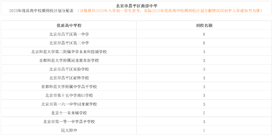 昌平区南邵中学2023年优质高中校额到校计划分配表已经公布,中考享有进入昌平一中、二中等12所优质高中校机会,供2020新初一和2021昌平小升初家长参考!