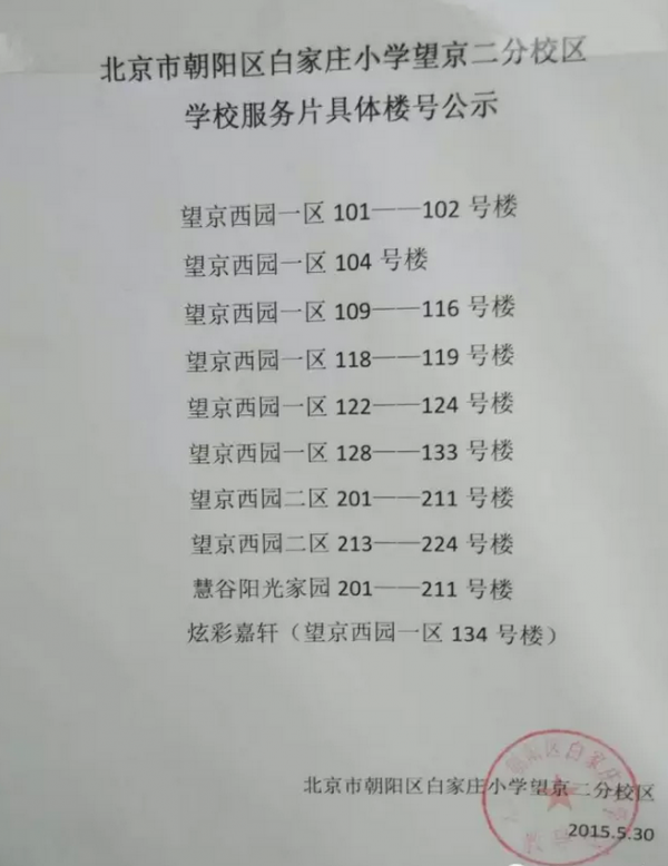 北京朝阳区白家庄小学望京二分校区学校服务片区具体楼号公示