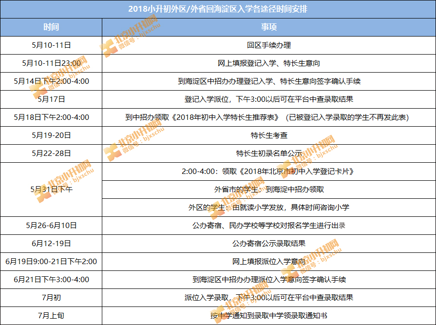北京小升初网(微信公众号搜索:北京小升初网)将2018小升初外区/外省回海淀区入学各途径时间安排整理如下,供2019/2020想要回海淀区小升初家长了解。