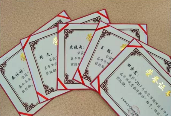 国学社指导教师秦佳林、张文、史晓雨、王颖、田素龙老师荣获“2017年北京市朝阳区中学生社团嘉年华优秀指导教师”称号。