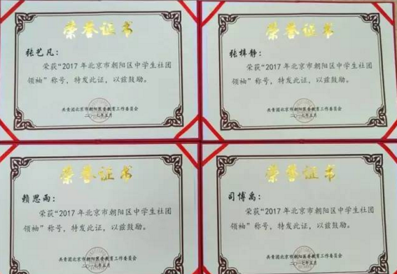 国学社学生干部张梓静、张艺凡、赖思雨、司博禹同学荣获“2017年北京市朝阳区中学生社团领袖”称号。