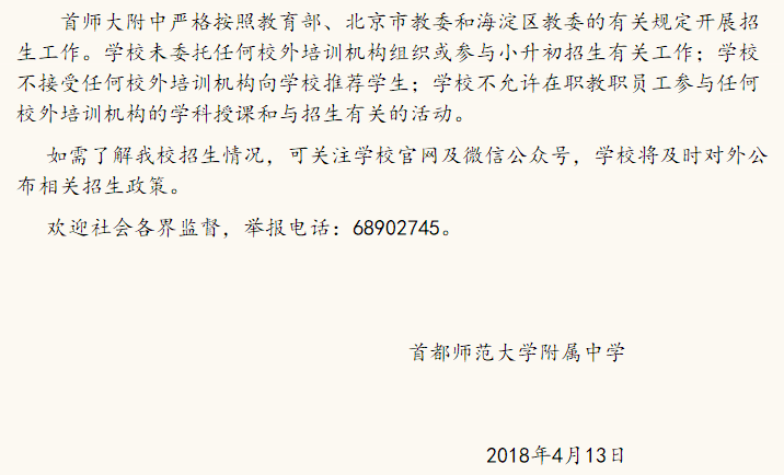 首师大附中严格按照教育部、北京市教委和海淀区教委的有关规定开展招生工作。学校未委托任何校外培训机构组织或参与小升初招生有关工作;学校
