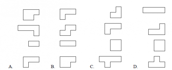 11.4个选项之中各有4个碎片,用碎片将下图铺满选项( )是不能将下图恰好不重不漏地铺满的(碎片可以旋转、翻转)