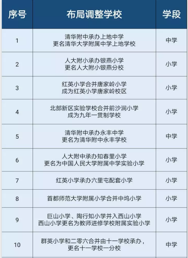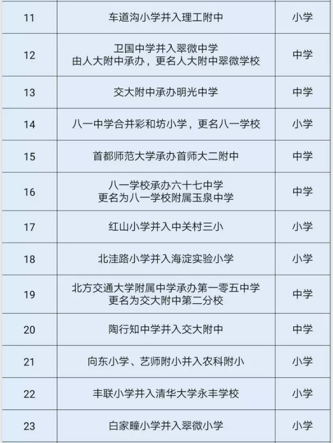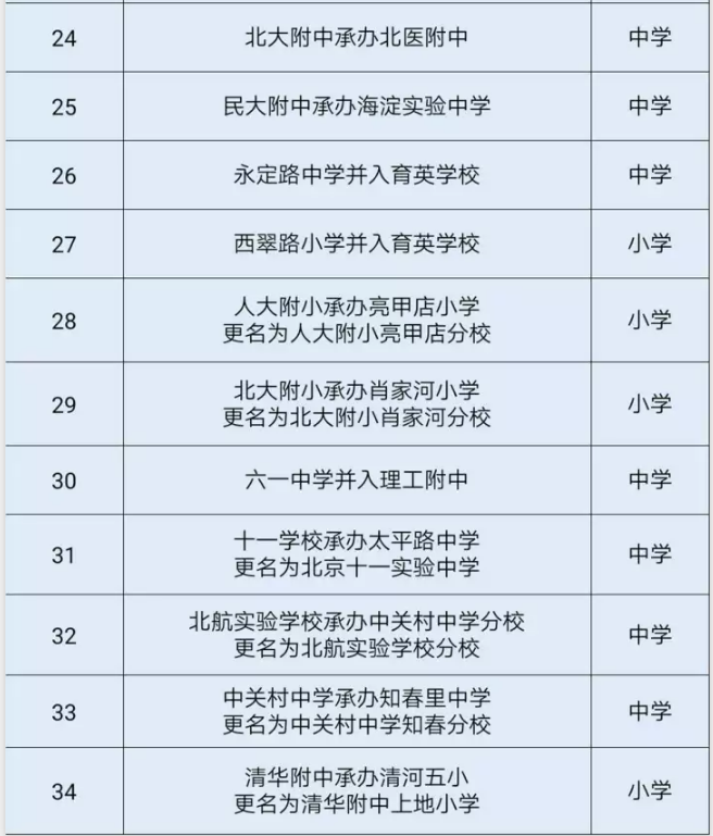 2017年海淀中小学合并承办、更名学校名单共34所,相关中小学有清华附中承办上地中学更名清华附中上地学校,十一学校承办太平路中学更名为十一中学实验学校。