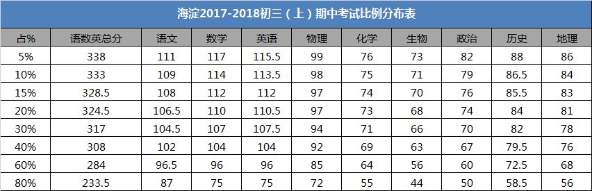 海淀区2017-2018学年初三上学期期中考试区排名和比例分布表如下,供学生及家长们查看。