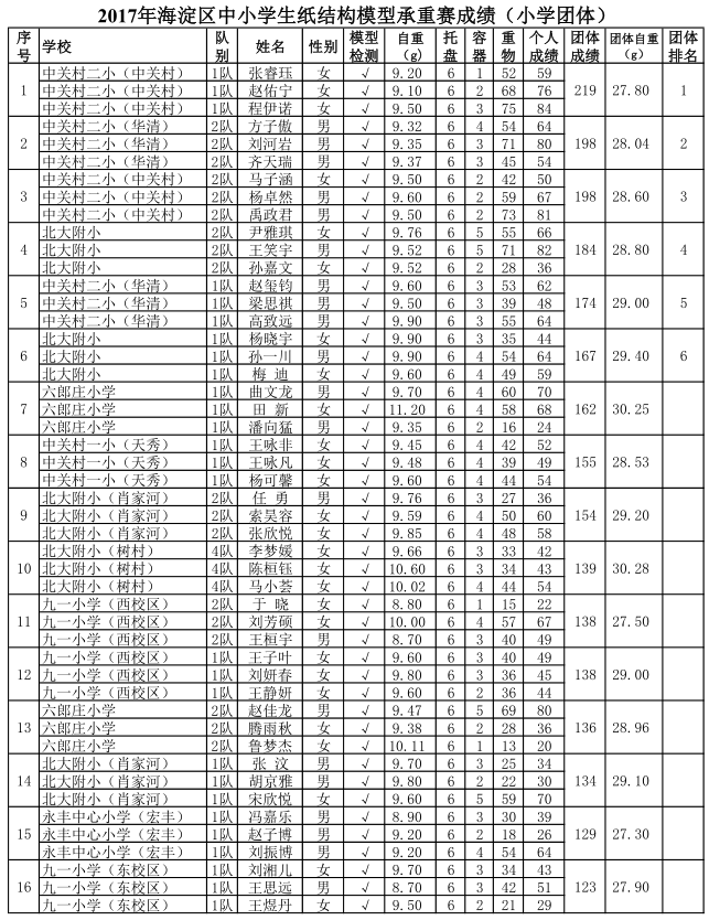 2017年海淀区中小学纸结构模型承重赛成绩(团体)已出,相关学校有北大附小、中关村一小、中关村二小、中关村中心虐、农大附中、五十七中学、石油附中等。