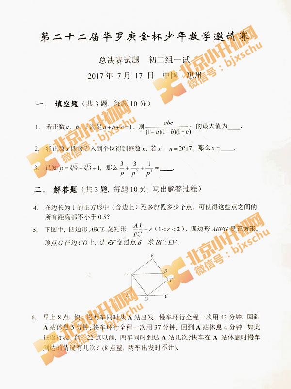 第22届华杯赛总决赛于7月17日上午在华罗庚中学拉开了序幕,有热心家长给北京小升初网分享了第22届华杯赛总决赛初二组一试试题,具体试题详情请见本文。