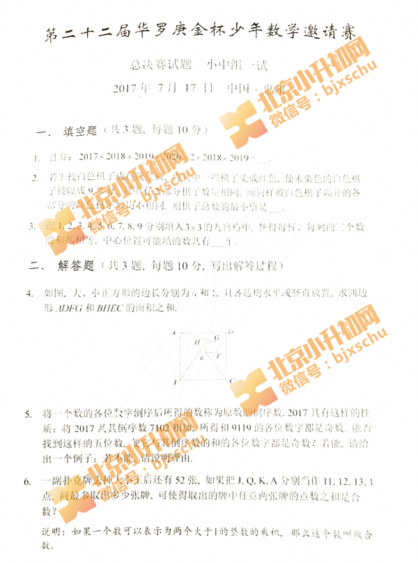 第22届华杯赛总决赛于7月17日上午在华罗庚中学拉开了序幕,有热心家长给北京小升初网分享了第22届华杯赛总决赛小中组一试试题,具体试题详情请见本文。