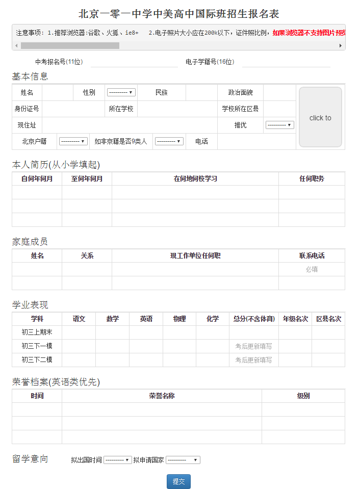 101中学2017年中美高中国际班网上报名正在进行中,需要填写的信息有:中考报考号、学籍号、基本信息、个人JL、家庭成员等等,101中学推荐家长使用谷歌、火狐等浏览器填写报名表,具体信息如下: