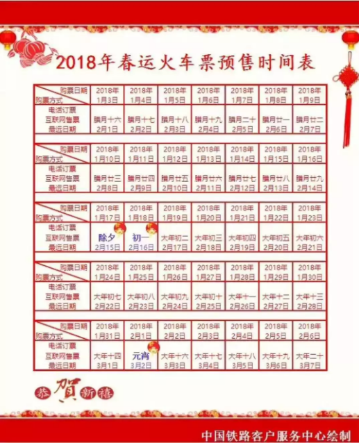 2018年1月1日就能买到春运首日(2月1日)的票了,1月17日就能买到除夕(2月15日)的票了,1月18日就能买到春节当天(2月16日)的票了。
