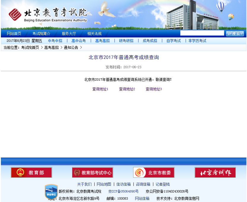 查询网址:http://www.bjeea.cn/html/gkgz/tzgg/2017/0623/66794.html