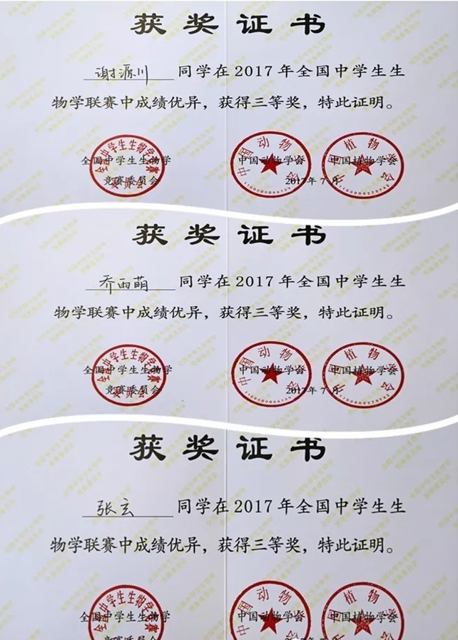 2017年全国生物学联赛三等奖:张玄、乔雨萌、谢源川