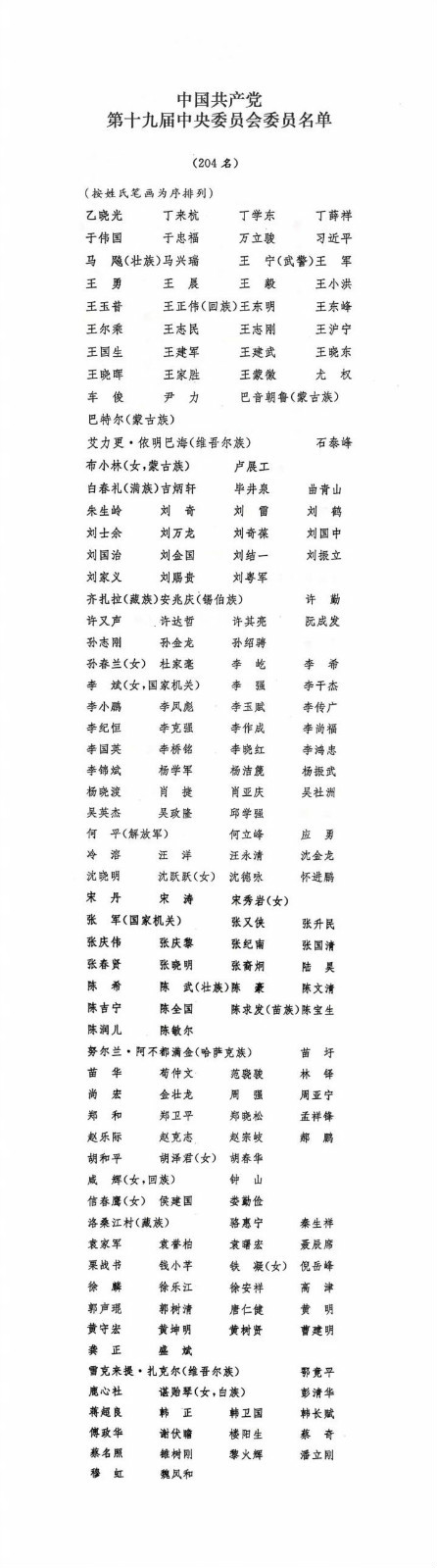 中国共产党第十九届中央委员会委员名单公布,共204名,详细名单,请看本文。