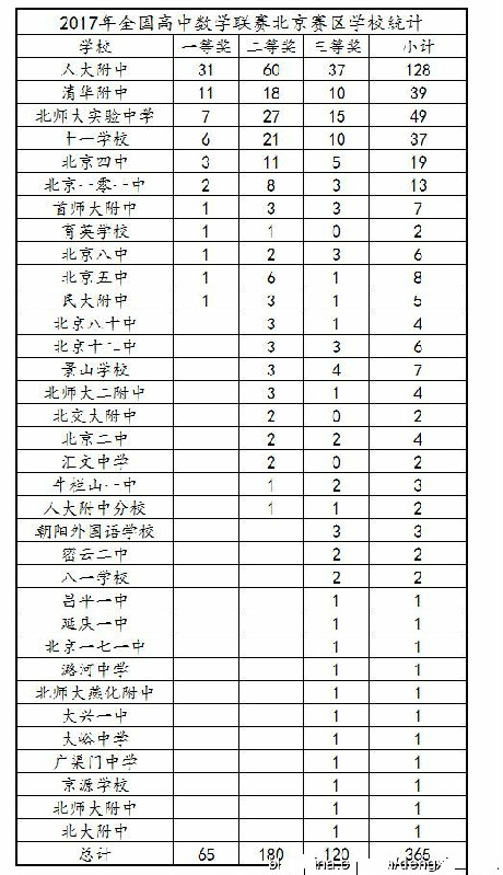 2017年全国高中数学联联赛北京赛区获奖学校名单已出炉,人大附中、十一学校、清华附中、北师大实验中学、北京四中、101中学、首师大附中、北京八中、八十中学等。