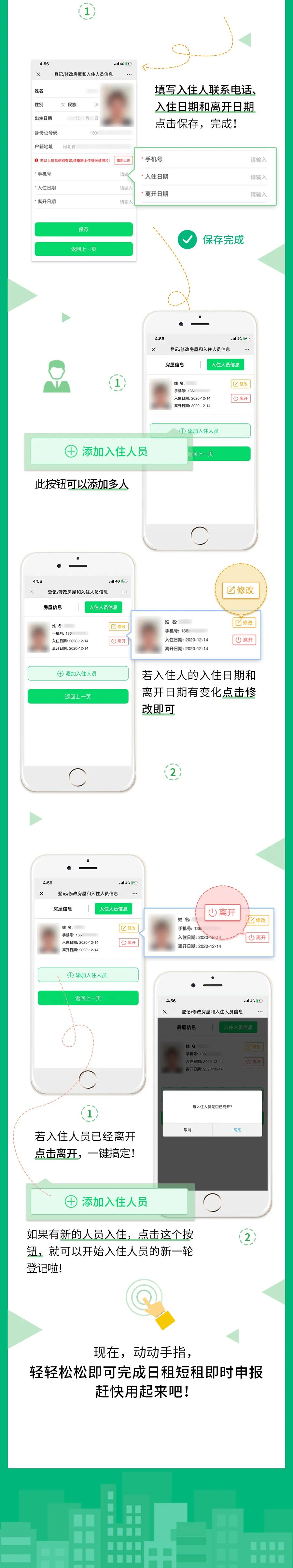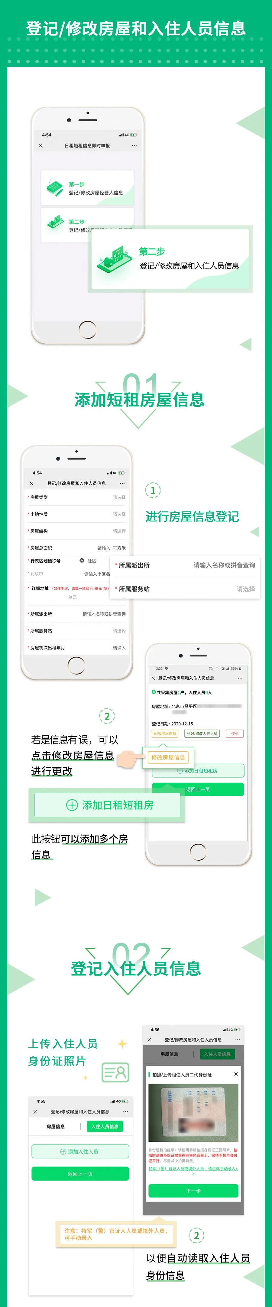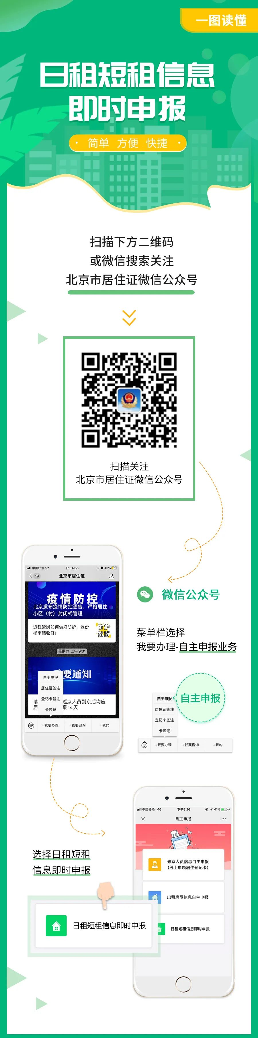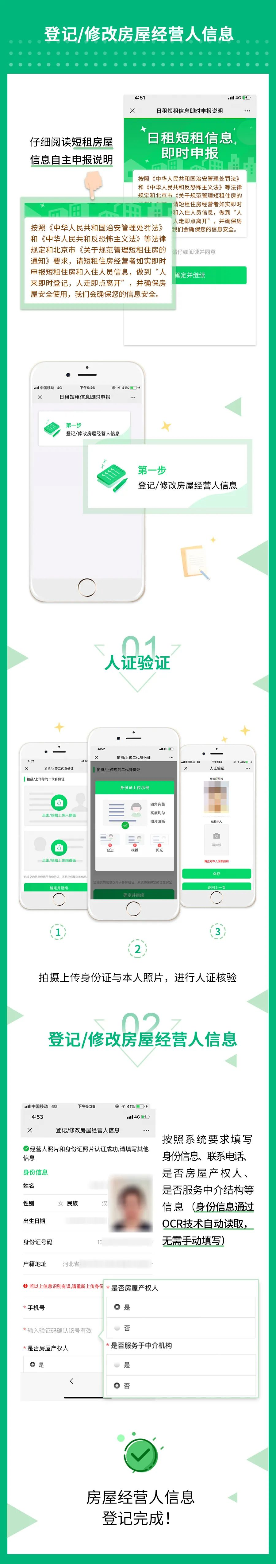 为落实上述规定,北京市公安局要求:通过规定的信息系统申报登记信息,即短租住房经营者须通过北京市居住证微信公众号→自主申报→日租短租信息即时申报,申报经营者本人、短租住房和住宿人员的身份信息,做到“人来即时申报、人走即点离开”。特别强调,经营者必须当面核对住宿人员的身份证件信息,严禁双方互不见面。不按规定申报即时信息的,公安机关可按照《中华人民共和国治安管理处罚法》和《中华人民共和国反恐怖主义法》予以处罚,具体操作流程如下。