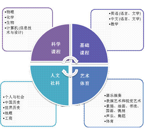 以IB课程理念为导向、MYP课程体系为框架, 兼容英国剑桥IGCSE和国内义务教育课程体系,重视基础知识积累,关注学习习惯和能力的培养,为学生的终身学习打下坚实的基础。