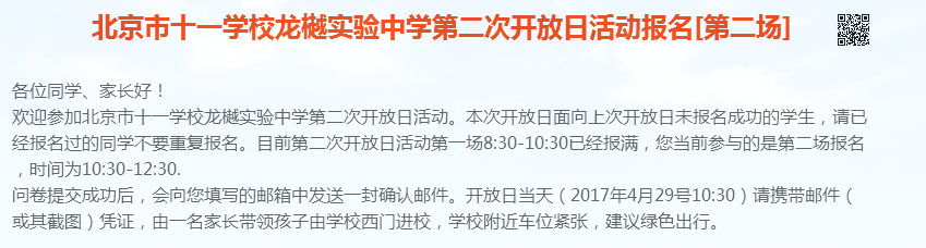 十一学校龙樾实验中学2017小升初第2场校园开放日活动将于4月29日进行,关注的家长这次一定要抓紧时间报名啦。