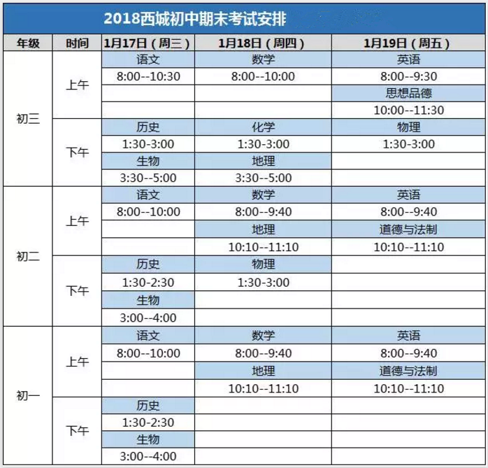 西城区2017—2018学年(上)初中期末考试时间确定,1月17日、1月18日,1月19日三天。本次期末考试为全区统考,初一,初二,初三年级同时考试。详细安排见下表: