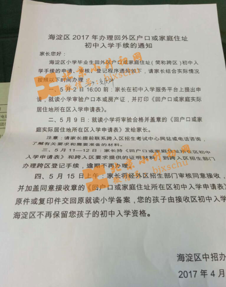 海淀区2017小升初办理回外区户口或家庭地址手续已出,5月2日16:00前:家长在初中入学服务平台上提出申请,就读小学审验户口本或房产证,并答应《回户口或家庭实际居住地所在区入学申请表》