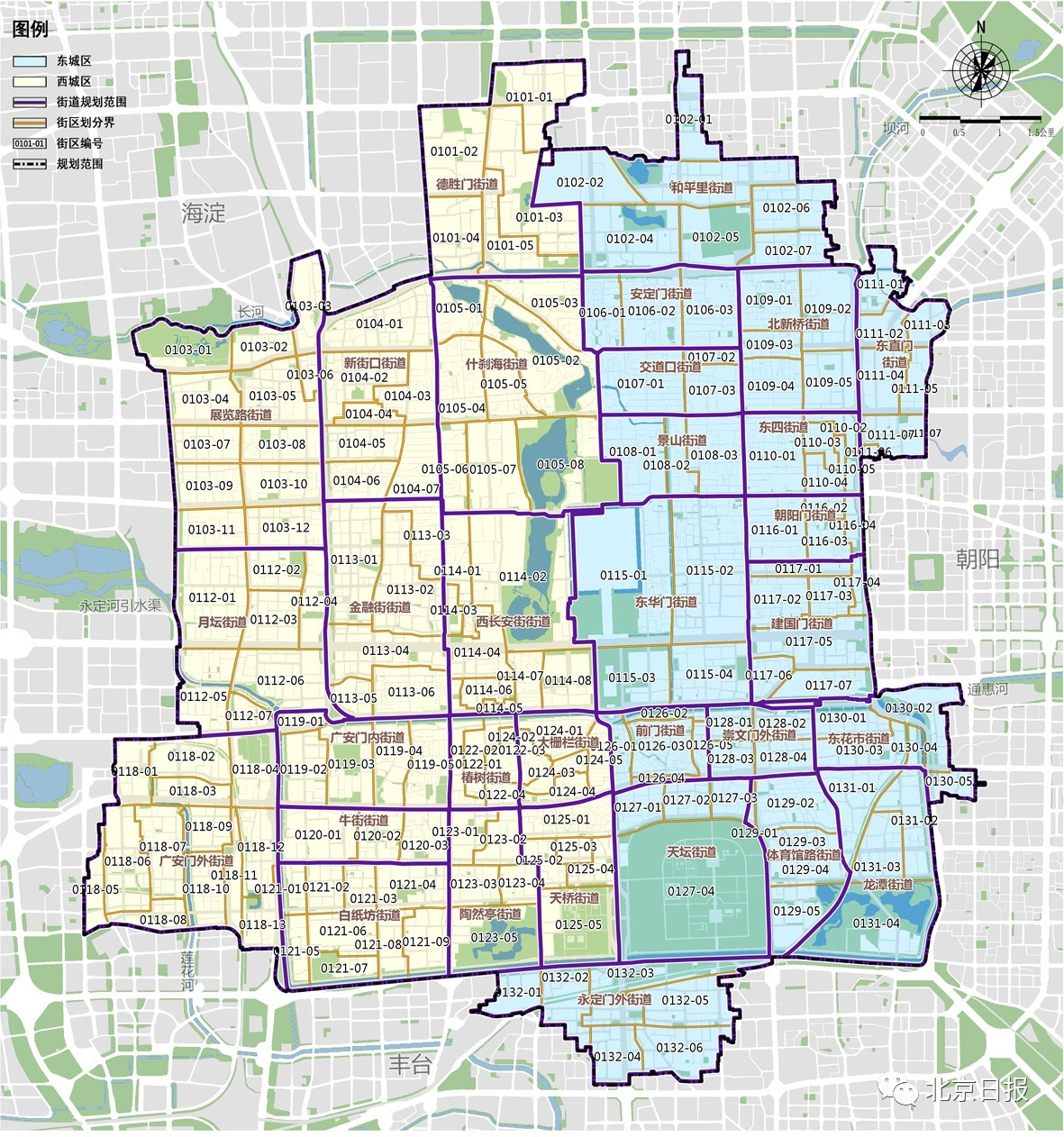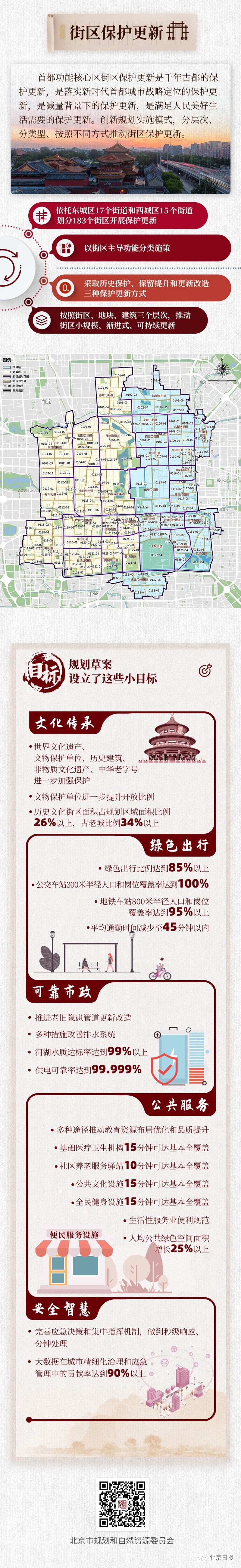 为贯彻落实北京城市总体规划的管控要求,构建“城市总体规划—街区层面控规—街区保护更新实施方案”的规划编制和实施体系,建立区级统筹、街道主体、部门协作、专业力量支持、社会公众广泛参与的街区保护更新实施机制。依托东城区17个街道和西城区15个街道进一步划分183个街区,每个街区面积大约0.4-1平方公里,大约涉及2-4个社区。以街区为单位,形成可直接指导实施落地的年度实施计划、项目库等,以科学合理配置土地及空间资源。