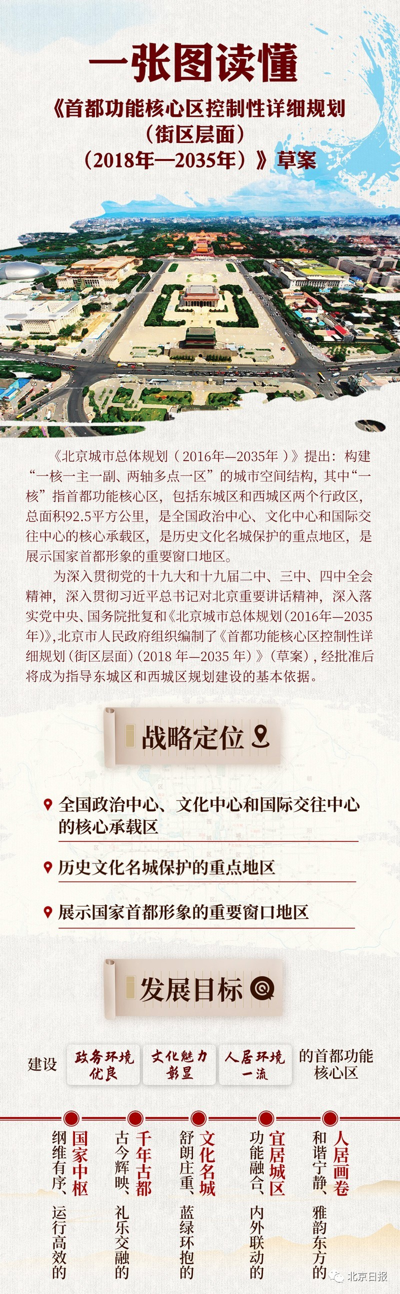 规划严格落实党中央、国务院批复的《北京城市总体规划(2016年—2035年)》对首都功能核心区的战略定位:首都功能核心区是全国政治中心、文化中心和国际交往中心的核心承载区,是历史文化名城保护的重点地区,是展示国家首都形象的重要窗口地区。