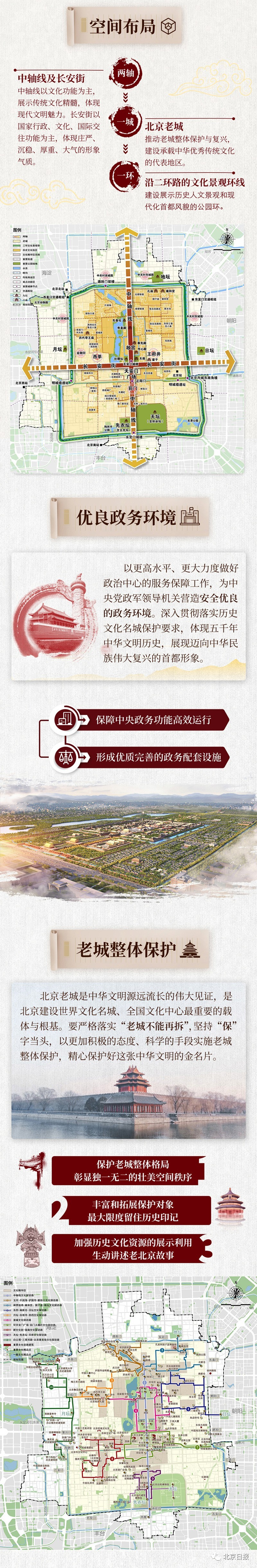 强化老城独特壮美的空间秩序:强化中轴线和长安街的空间统领作用,扎实推进中轴线遗产保护。全面强化老城空间的整体性,依托城址遗存、棋盘路网、历史水系、九坛八庙保护,综合运用多种手段让历史文化融入城市景观。