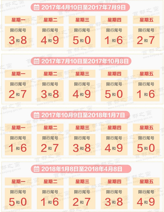为有效降低机动车污染物排放,持续改善首都空气质量,市政府决定自2017年4月10日至2018年4月8日,继续实施工作日(因法定节假日放假调休而调整为上班的星期六、星期日除外)高峰时段区域限行交通管理措施。