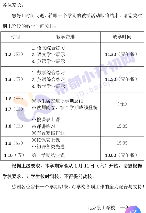 以下是东城区景山学校2025元旦放假、期末考通知,仅供参考