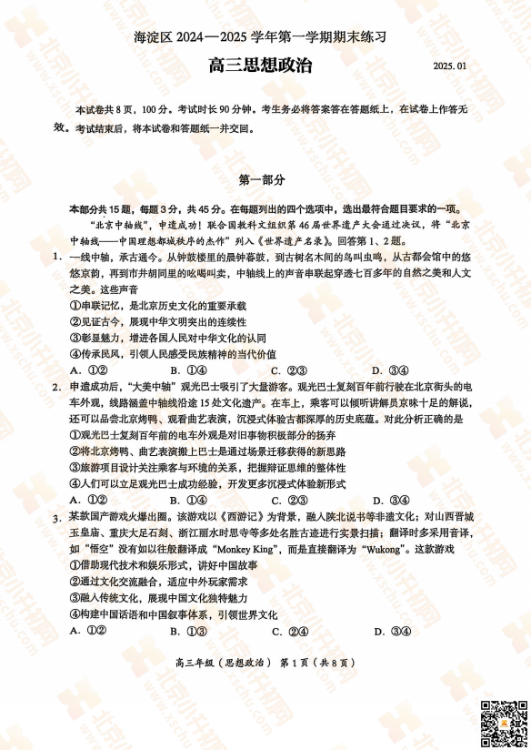 2024-2025学年第一学期海淀高三政治期末试卷(含答案)分享,详情见下,随北京小升初网了解一下: