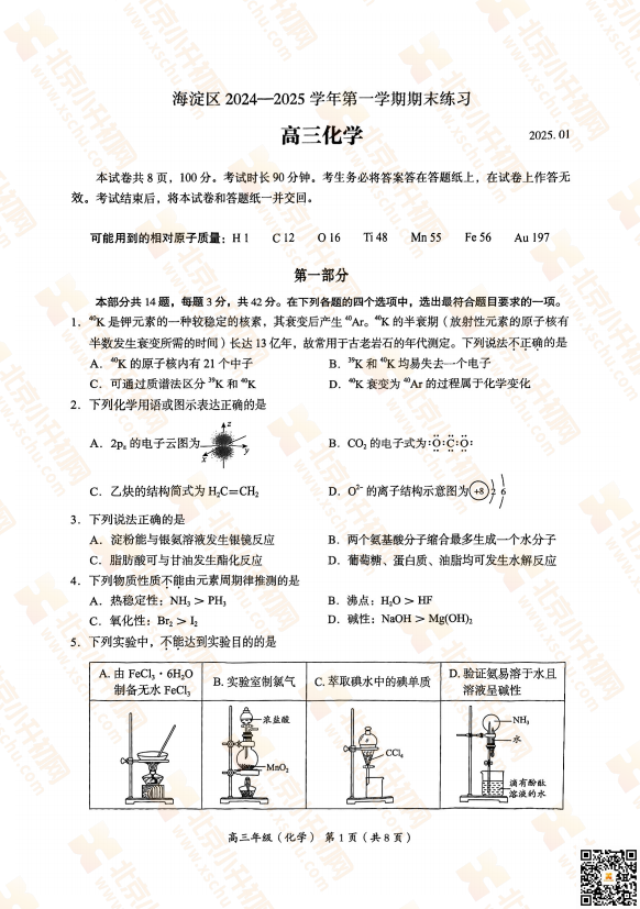 2024-2025学年第一学期海淀高三化学期末试卷(含答案)分享,详情见下,随北京小升初网了解一下: