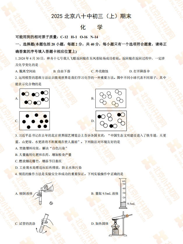 八十中初三期末化学试卷八十中初三期末试卷2025八十中初三期末试卷