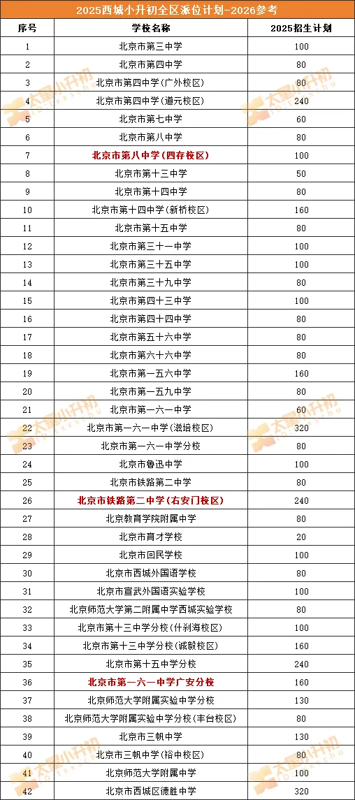 2025西城小升初全区派位途径新增3所新校区招生,分别为八中四存校区、铁二右安门校区、161中广安分校,各校招生计划如下: