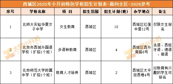 西城小升初面向全区招生途径、计划-2026小升初参考