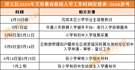 2026年密云区义务教育阶段入学工作时间安排(幼升小、小升初)