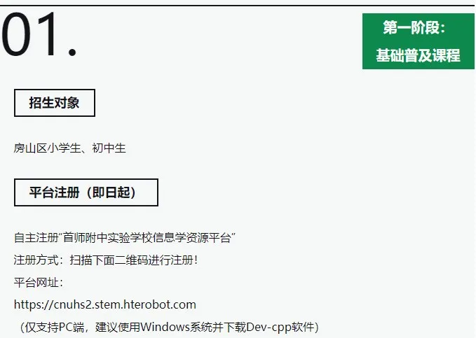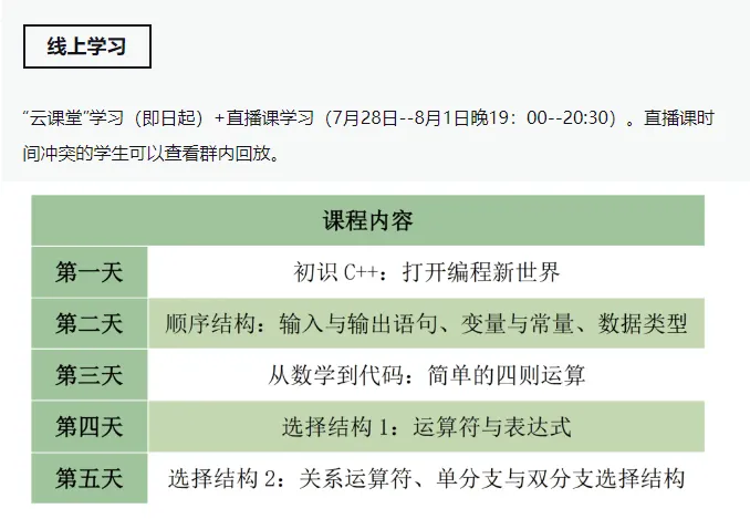 本次首师附中实验学校信息学创新人才培养活动分为两个阶段,第一阶段为基础普及课程,7月28日-8月1日进行,课程结束后进行测试,测试优秀的同学可以继续参加第二阶段的培养学习。