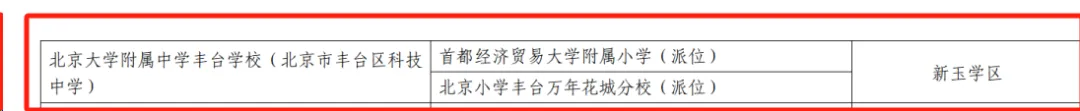 👇增1所学校——北大附中丰台学校(丰台科技中学),单校划片面向首都经济贸易大学附属小学、北京小学丰台万年花城分校招生,多校划片面向新玉学区招生;