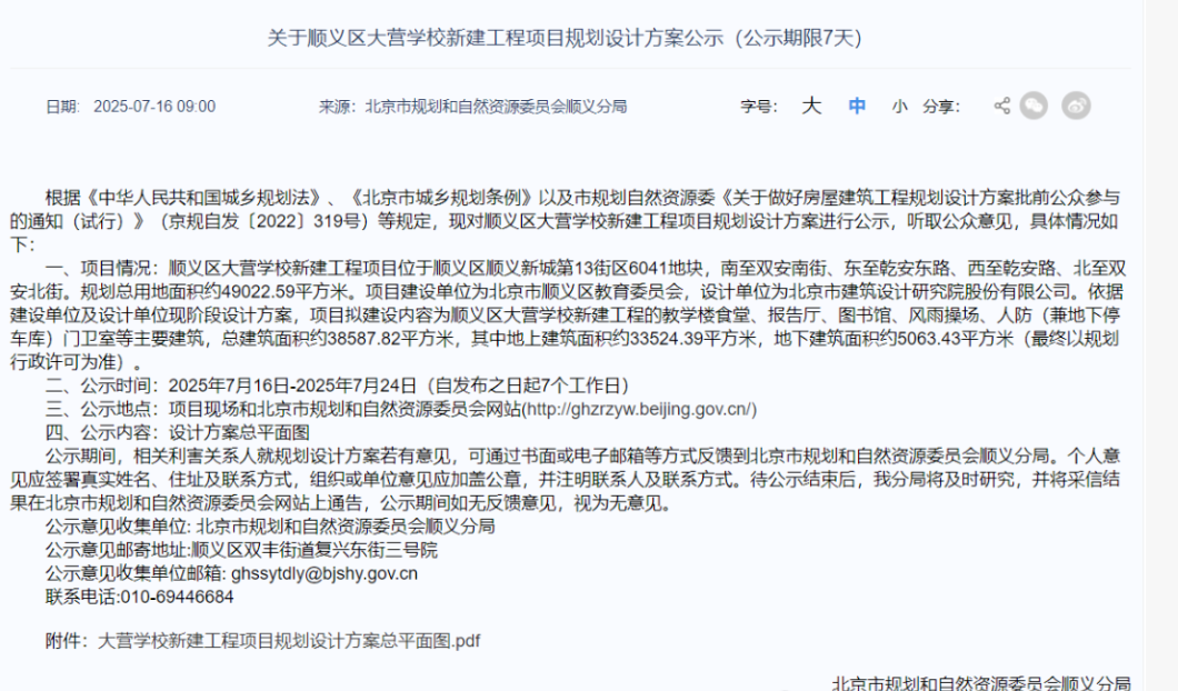 北京市规划和自然资源委员会发布顺义区大营学校新建工程项目规划设计方案公示,这标志着该新建工程取得新进展。