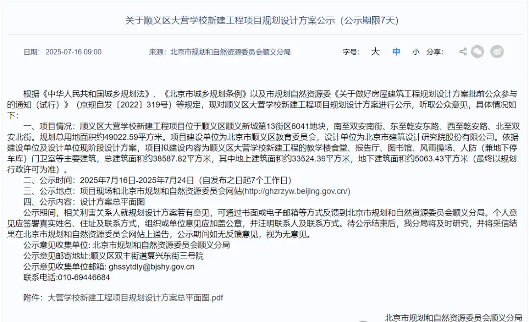 近日,北京市规划和自然资源委员会发布顺义区大营学校新建工程项目规划设计方案公示,这标志着该新建工程取得新进展。