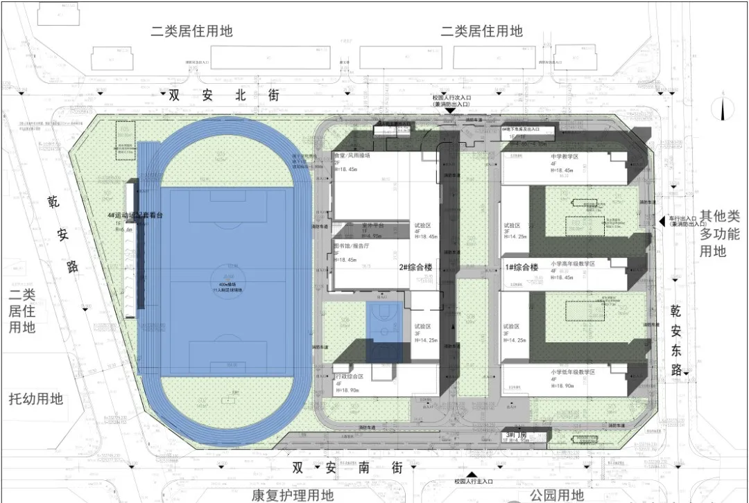 据公示内容,顺义区大营学校新建工程项目是一所54班(其中小学36班、初中18班)九年一贯制学校,可提供2,160个学位,其中小学学位1,440个,初中学位720个。位于顺义区顺义新城第13街区6041地块,南至双安南街、东至乾安东路、西至乾安路、北至双安北街。规划总用地面积约49022.59平方米。