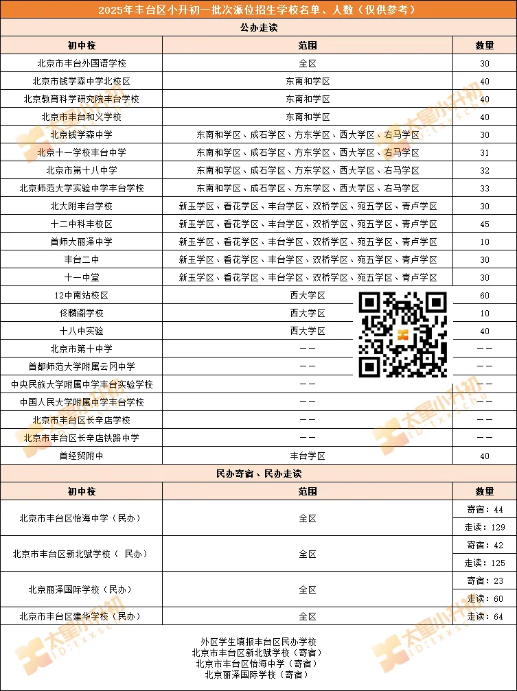 2025年丰台小升初一批次入学途径包括:公办走读、民办走读、民办寄宿。各初中校招生计划、招生范围等详见下表!2026小升初家长可提前了解~
