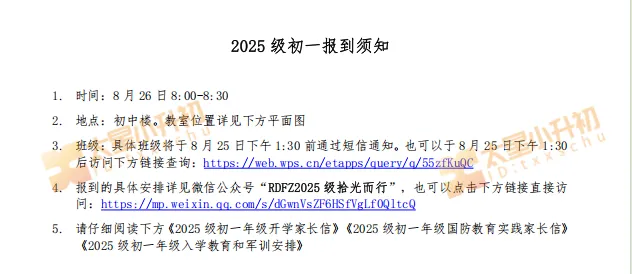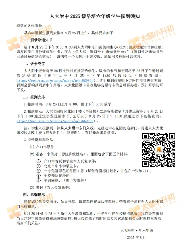 重磅提醒,人大附中2025年报到须知发布,新6年级、新初一8月26日上午报到,新初一入学军训安排已定!随北京小升初网一起来看详情!