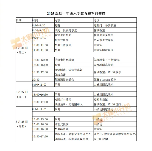 人大附中2025年新6年级、新初一报到时间为8月26日上午,新初一报到后军训安排定了,详情见下表: