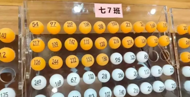 摇号分班的形式是:透明箱里装着带有号码的乒乓球,每个号码从里面摇出来,分到各个年级里面。详情如下: