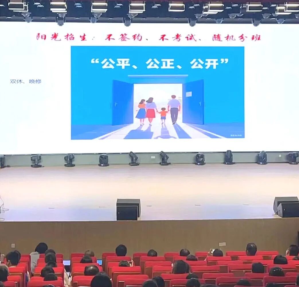 仪式现场,大礼堂里坐满了人,大屏幕上显示“公平、公正、公开”,阳光招生:不签约、不考试、随机分班。