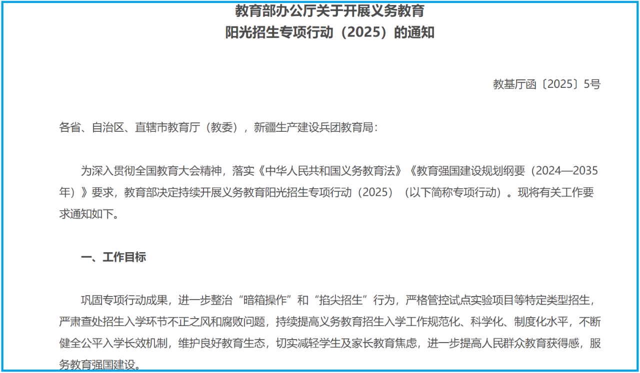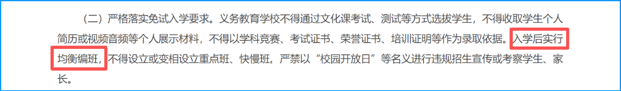 值得关注的是,和去年相关文件对比后发现,今年的“阳光招生专项行动(2025)的通知”中新增一句话“入学后实行均衡编班”,意味着“阳光招生”进一步从严。