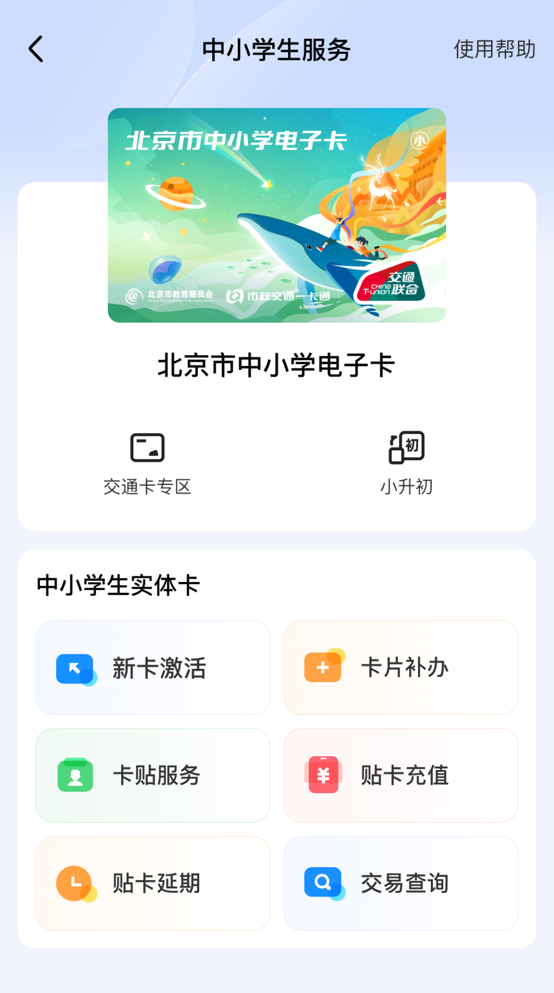 注意:若为小升初、初升高阶段的学生,需通过“北京一卡通”APP进行“卡片升学”操作,更新学籍信息后即可继续使用。