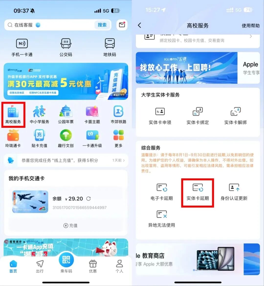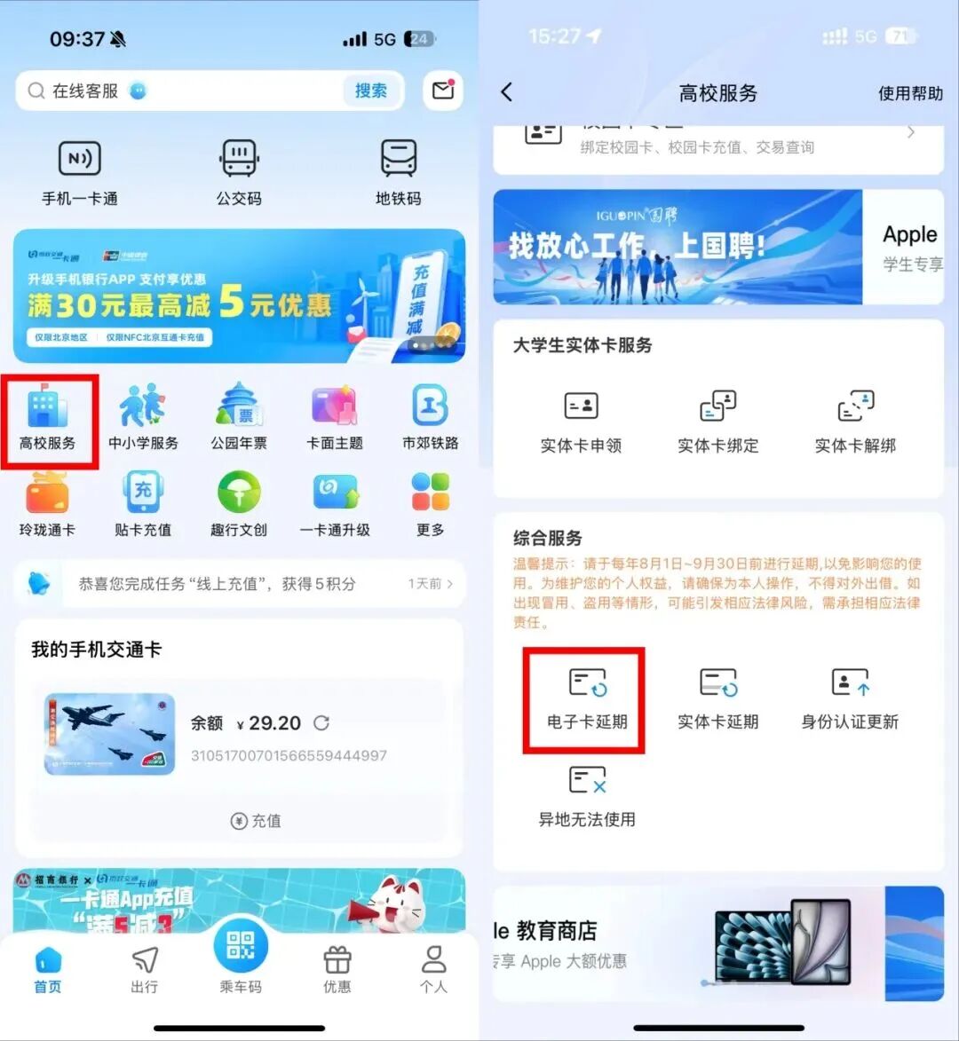 延期方法:打开最新版“北京一卡通”APP,点击首页“高校服务”,选择“电子卡延期”,根据操作提示即可轻松完成。
